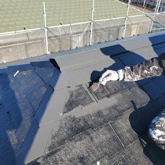 屋根はコロニアル材のため、下塗り2回でしっかり吸い込み止めを実施。