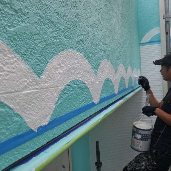 今回のお客様からは「波みたいな模様にしたい!」というワクワクするご相談をいただき、初めての模様施工にチャレンジしました。何度も何度も打ち合わせを重ねて、色の調整や塗り方の工夫を試行錯誤。台風で塗料の乾燥が長引くハプニングもありましたが、チーム一丸となって乗り越え、無事に理想の仕上がりに!完成を見たお客様の笑顔にスタッフ全員が大喜びです😇
