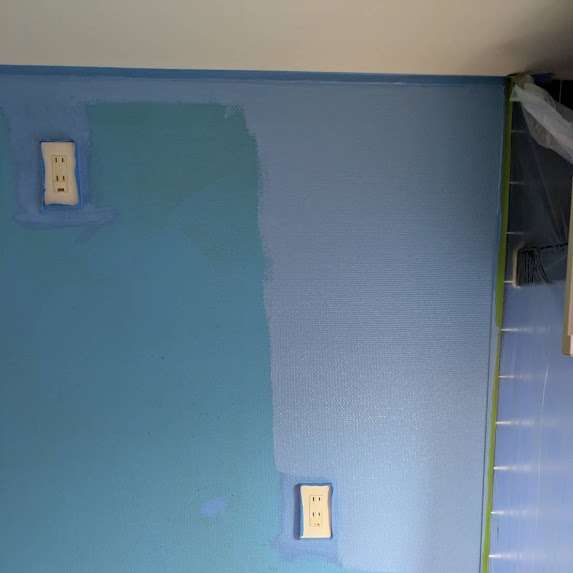 今回はクロスの上から青い壁にアクセント塗装を実施😄。単なる白い壁が、一気に華やかでおしゃれな空間に変身しました✨