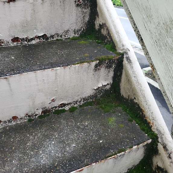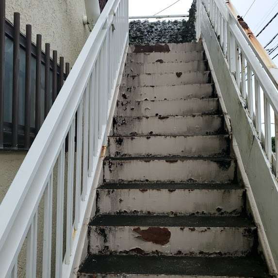 「鉄階段の塗装がめくれてきていて、階段に苔も生えて滑りやすくなっている」とのご相談でした。