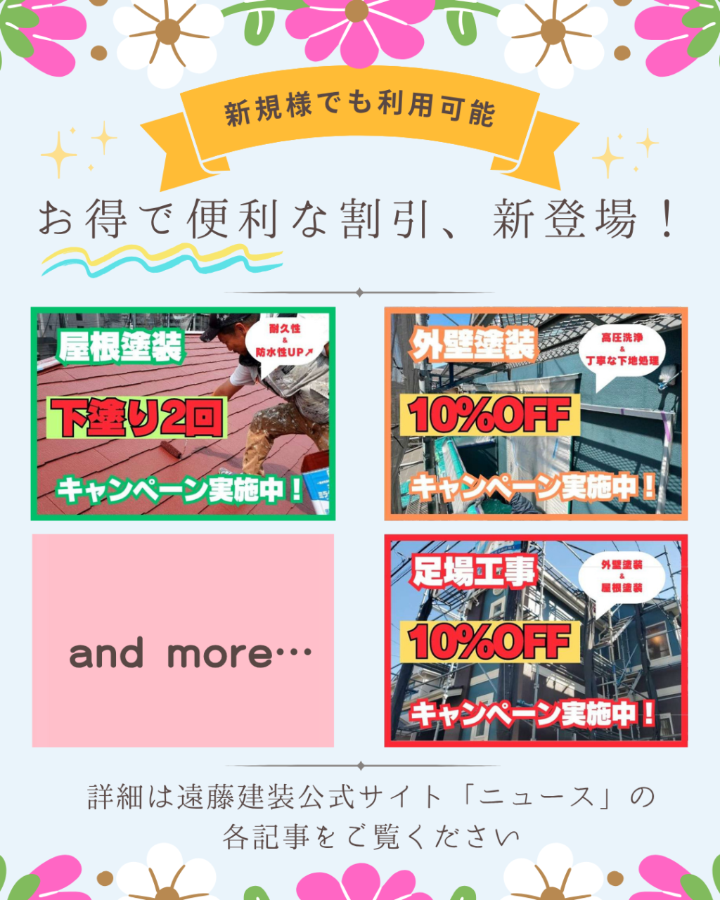 さらに、季節や期間限定のキャンペーンも随時開催中!詳細はその都度お問い合わせください。建物とお客様のことを日々考えている遠藤建装だからこそ実現できる、コスパとクオリティをぜひ体験ください。お得な情報や割引とこだわりのサービスで、皆さまの住まいをしっかりサポートいたします!建物の長持ちと見た目の美しさを両立するためのこだわりが、弊社のプランには詰まっています。